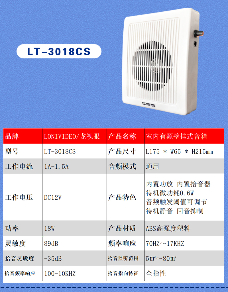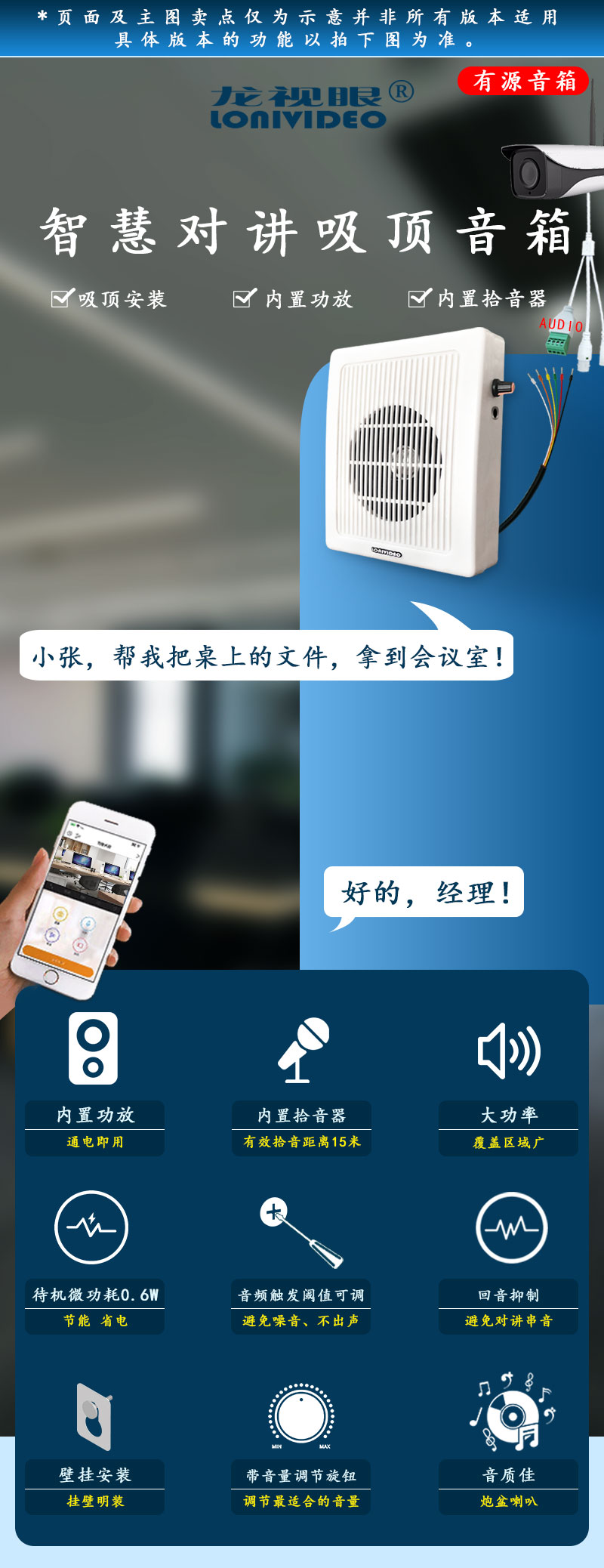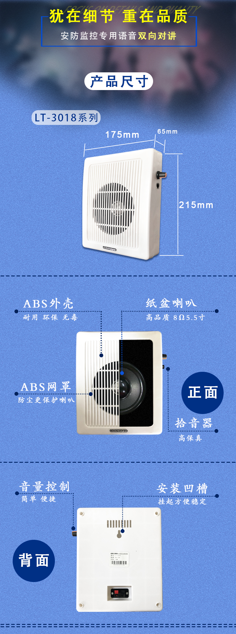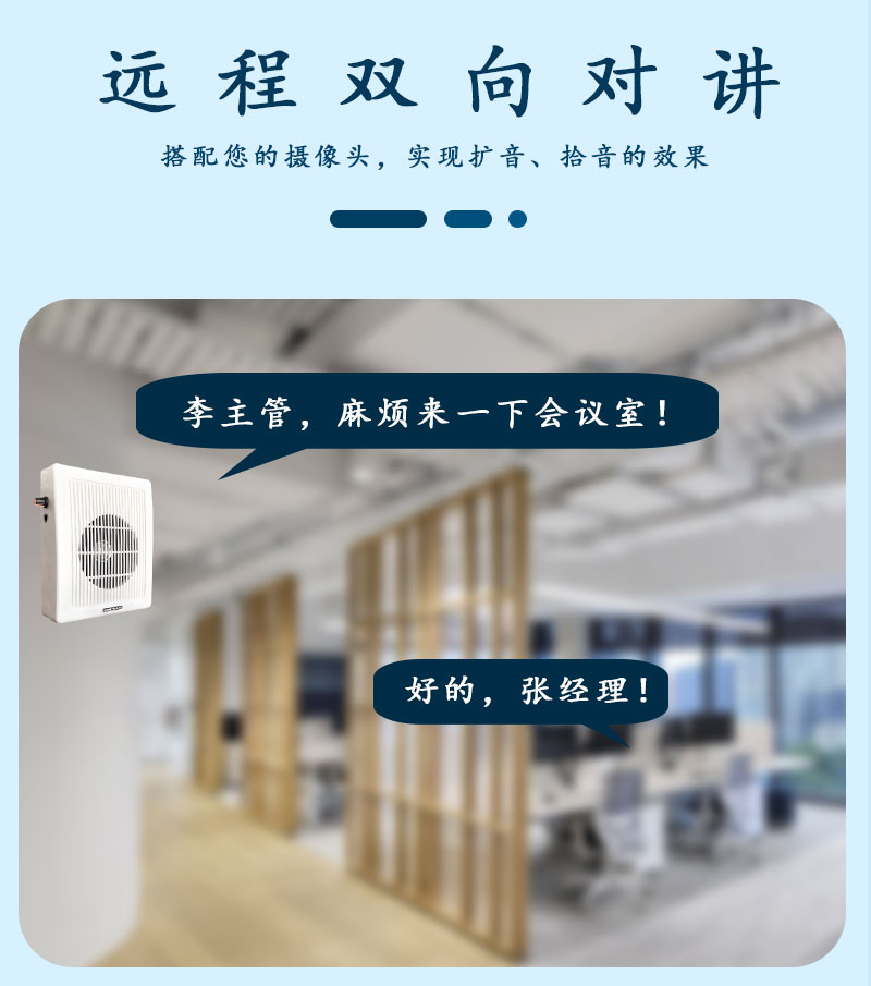 監(jiān)控攝像頭外接喇叭內置功放拾音器咪頭低功耗高保真待機靜音回音抑制音頻觸發(fā)閾值可調有源雙向對講掛壁音箱
